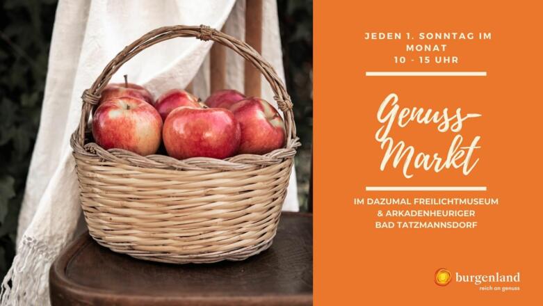 Jeden 1. Sonntag im Monat findet der Genussmarkt im DZUMAL Freilichtmuseum in Bad Tatzmannsdorf statt! In den Sommermonaten kann man den Marktbesuch mit einem Frühschoppen im Arkadenheurigen kombinieren.