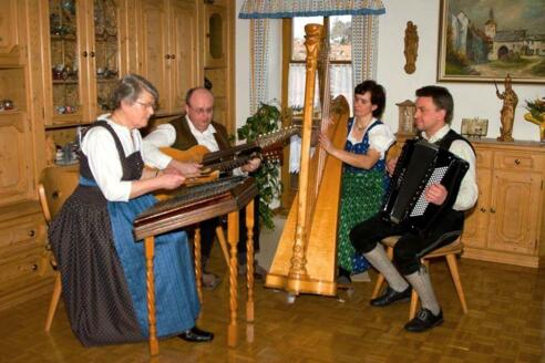 Unsere Volksmusikgruppe mit Hackbrett, Harfe, Akkordeon und Kontragitarre bietet bodenständige Volksmusik, sowohl tänzerisch (Landler, Polka, Zwiefache) als auch besinnlich.