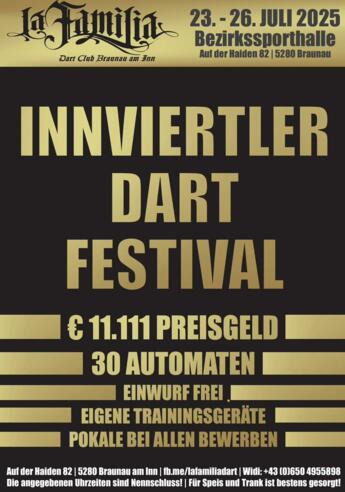 Der Dart-Club „La Famiglia“ veranstaltet das Innviertler Dart Festival. Es wird um ein Preisgeld von 11.111,-- Euro gespielt. Dazu gibt es 30 Automaten, eigene Trainingsgeräte bei freiem Einwurf. Bei allen Bewerben werden auch Pokale überreicht.