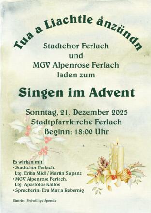 Der Stadtchor Ferlach und der MGV Alpenrose Ferlach laden ein zum "Singen im Advent" in der Stadtpfarrkirche Ferlach.