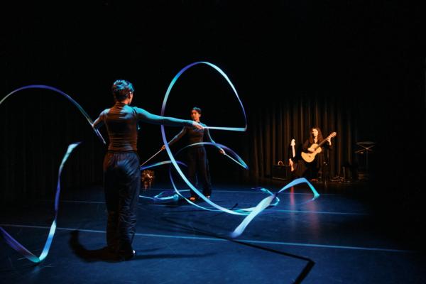 Zwei Performerinnen erkunden mit feinem Gespür die Ausdruckskraft verschiedener Textilien: Sie legen, werfen, wirbeln und wiegen die Stoffe, wodurch sich deren verborgene Schichten und Geschichten offenbaren. Begleitet von live gespielter barocker Gitarrenmusik entstehen dabei zarte Flügelschläge, schimmernde Muster und unsichtbare Spuren, die den Raum in einen schwebenden Fluss verwandeln.