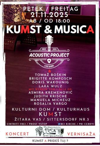 »Kumst & Musica« ist eine Veranstaltung, die sich im Rahmen von Kunst und Musik dem »Miteinander« widmet. Es sind lokale Künstler und leidenschaftliche Musiker, die ihrer handgemachten Musik in verschiedenen Stilrichtungen und Kreativität Ausdruck verleihen. Durch den gegenseitigen Austausch und das feine Beisammensein von Menschen in einem wohltuenden Ambiente, versucht die Veranstaltung ihre Besucher:innen für Positives zu begeistern und inspirieren.