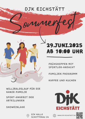Jedes Jahr findet das Sommerfest der DJK Eichstätt statt, dieses Jahr wird von Weißwurstfrühstück bis Hüpfburg einiges geboten, darunter auch eine Tanzeinlage, Kaffee und Kuchen und diverse Sportangebote. Das Ziel unseres Sommerfestes ist es allen unseren Sportabteilungen eine Plattform zu geben, sich vorzustellen und allen Besuchern die Möglichkeit zu geben sich in den verschiedenen Sportarten selbst einmal auszuprobieren.
