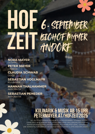 Am 6. September findet am Biohof Mayer zum ersten mal die HOFZEIT statt. Zeitlos genießen am Biohof Mayer und das mit allen Sinnen. Gegrilltes aus hofeigenen Produkten, Partnerakrobatik und ein Konzert in einen lauen Sommerabend hinein. Es spielen Nora und Peter Mayer mit Special Guest Claudia Schwab.