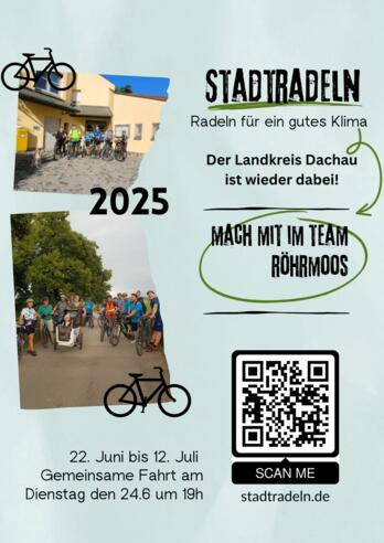 Aktionszeitraum Stadtradeln 2025 in der Gemeinde Röhrmoos. Alle Radlbegeisterten sind aufgerufen, mitzumachen. Anmeldung unter https://www.stadtradeln.de/index.php?id=171&L=0&team_preselect=2423