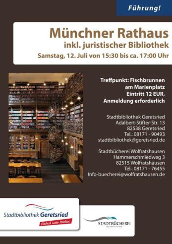 Für alle Architektur- und Bibliotheks-Begeisterten:Gemeinsam mit der Stadtbücherei Wolfratshausen bietet die Geretsrieder Stadtbibliothek auch in diesem Jahr wieder eine Führung in München an. In diesem Jahr bekommen wir einen Einblick in ein der schönsten Bibliotheken Münchens: die juristische Bibliothek im Neuen Rathaus.Treffpunkt: