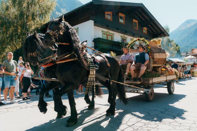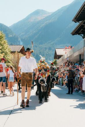 bei dem prächtig geschmückte Kühe von der Alm ins Tal zurückkehren.