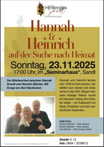Der Verein Hinterglas SANDL veranstaltet am Sonntag, 23. November 2025 um 17:00 Uhr eine musikalische Lesung mit Monika Holzmann.