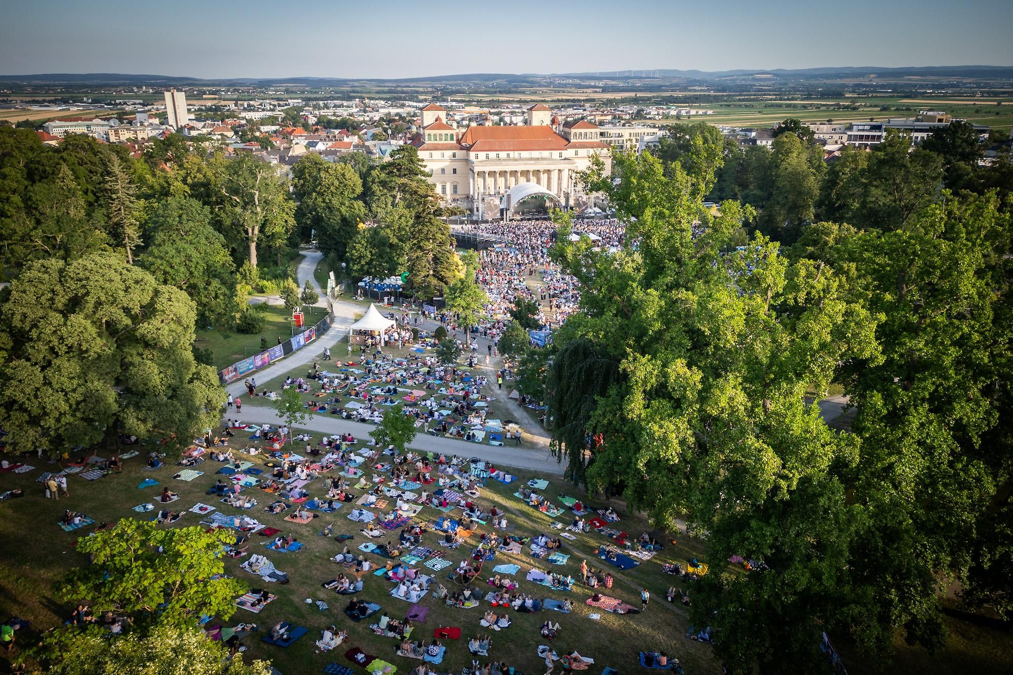 Das Festivalgelände rund um die altehrwürdigen Gemäuer des Schlosses Esterházy bietet eine traumhafte Kulisse. Die Besucher:innen können das vielfältige musikalische Programm genießen, zwischendurch in den Hängematten entspannen und im VIP-Bereich wird ein köstliches Buffet aufgetischt.