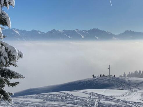 Mit dem Sessellift erreichst Du sehr komfortabel den Ausgangspunkt dieser Schneeschuhwanderung - die Bergstation des „Weltcup-Express“, wo Du von einem grandiosen Alpenpanorama empfangen werden. Von hier führt die Tour zunächst hinauf zum Ofterschwanger Horn. Begleitet von traumhaften Ausblicken in Richtung Allgäuer Hauptkamm, Nagelfluhkette und Illertal folgt nun der kurze Abstieg zur Fahnengehrenalpe, bevor der Aufstieg zum Gipfel des Sigiswanger Horns beginnt. Schon bald ist der 2. Gipfel geschafft! Nach einer verdienten Gipfelrast geht es zurück zur Bergstation, ehe Du mit dem Sessellift – und „den beiden Hörnern in der Tasche“ - wieder entspannt nach Ofterschwang hinunterschweben.