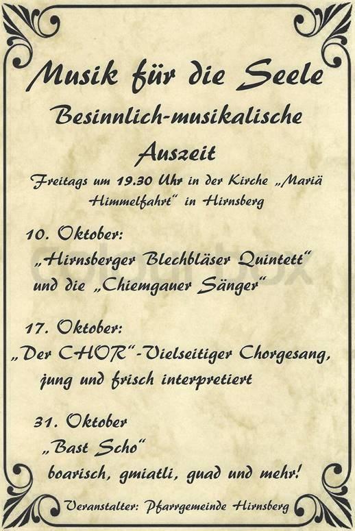 Wie schon seit fast 20 Jahren, kann der Pfarrgemeinderat Hirnsberg auch in diesem Herbst in Zusammenarbeit mit verschiedenen Musik- und Gesangsgruppen zur Veranstaltungsreihe „Musik für die Seele“ in die Kirche nach Hirnsberg einladen. Bei den musikalisch-besinnlichen Freitag-Abenden können sich die Besucher eine kleine Auszeit vom Alltag nehmen und sich gänzlich den dargebotenen Klängen und Gesängen hingeben. Den Anfang machen am 10. Oktober das „Hirnsberger Blechbläser Quintett“ und die „Chiemgauer Sänger“ unter dem Motto „Klassischer Blechbläserklang trifft alpenländischen Männer-Vierg’sang“. Am 17. Oktober wird der Abend von der Gesangsgruppe „Der CHOR“ gestalltet. Geboten wird vielseitiger Chorgesang, jung und frisch interpretiert. Den Abschluss am 31. Oktober macht die eigentlich mehr aus Bierzelten bekannte Gruppe „Bast Scho – Boarisch, gmiatli, guad und mehr“. Veranstaltungsbeginn ist jeweils um 19:30 Uhr bei freiem Eintritt.