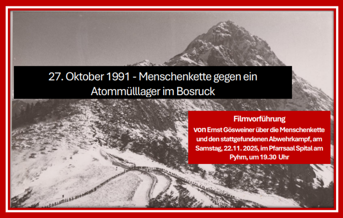 Vor einem 1/3 Jahrhundert hat man versucht, im Bosruck-Massiv ein Tiefenlager für schwach- und mittelradioaktiven Müll zu errichten. Der bewundernswerte Abwehrkampf im Jahr 1991 wurde in einem Film (Abwehrkampf und Menschenkette) dokumentiert. Der mittlerweile historische und interessante Film wird im Pfarrsaal Spital am Pyhrn nochmals gezeigt.