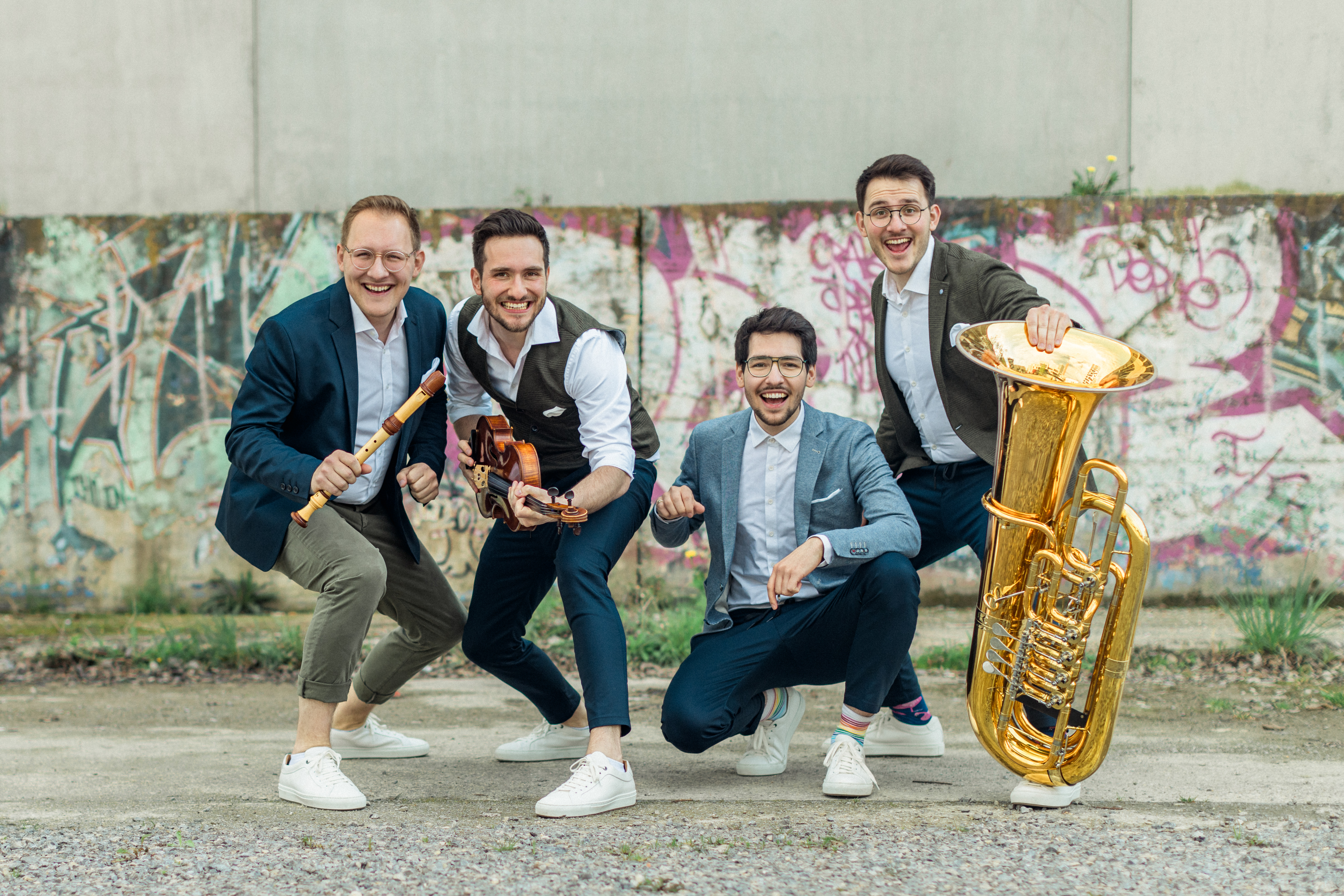 Hanke Brothers | David (Blockflöte, Moderation), Lukas (Viola, Perkussion, Joni (Klavier, Komposition), Fabian (Tuba, Violine)