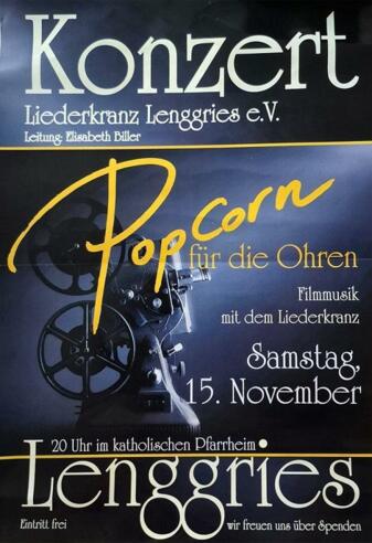 Unter dem Motto "Popcorn für die Ohren" wird Filmmusik zum Besten gegebenLeitung: Elisabeth BillerPfarrheim Lenggries an der GeiersteinstraßeDer Eintritt ist frei - Spenden sind willkommen.