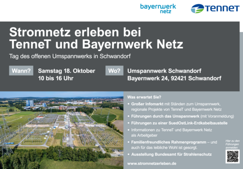 Am Samstag, 18. Oktober öffnen TenneT und Bayernwerk Netz von 10–16 Uhr die Tore des Umspannwerks Schwandorf.