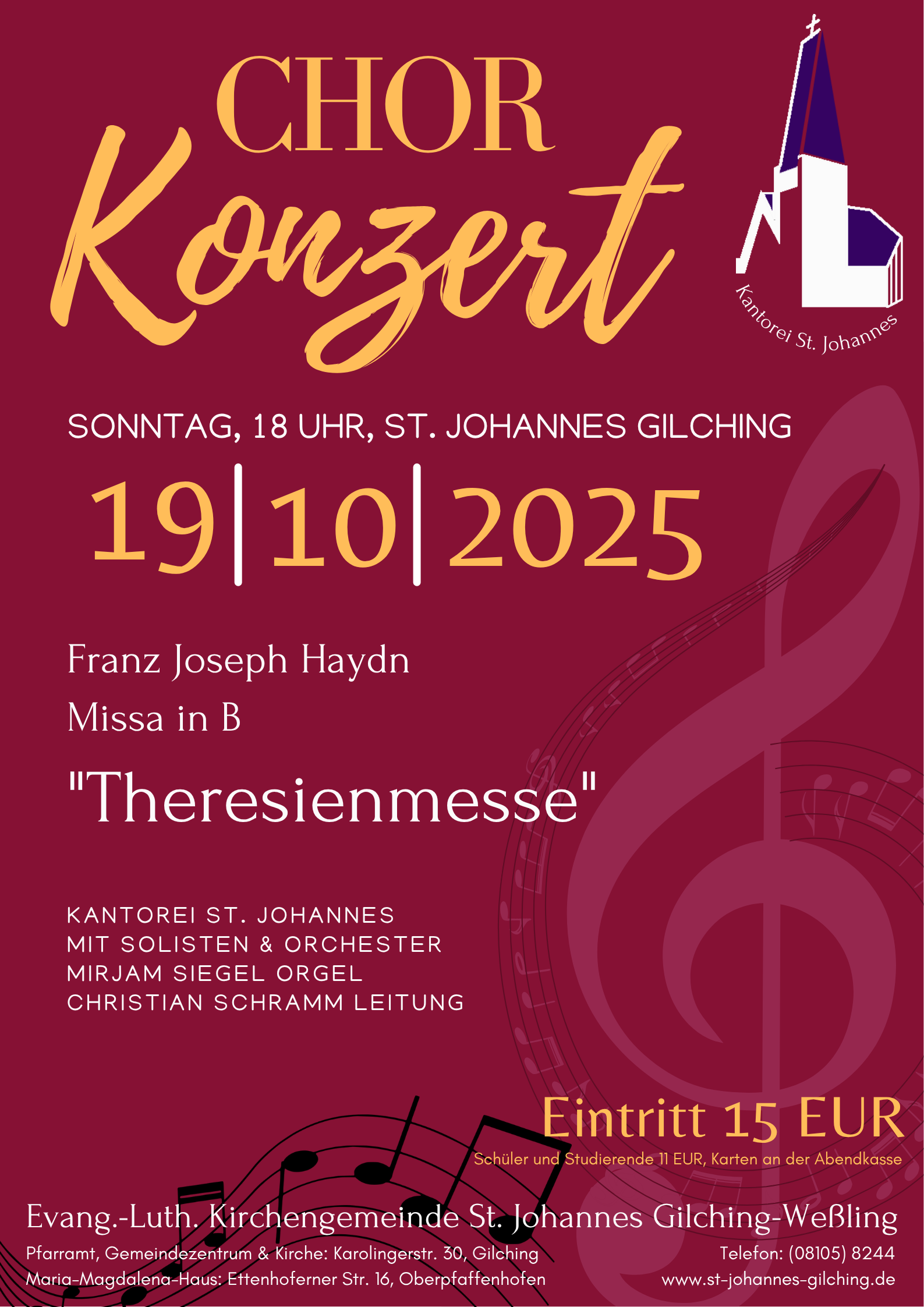 Ein musikalischer Höhepunkt erwartet Sie am Sonntag, den 19. Oktober 2025 um 18 Uhr in der St. Johanneskirche Gilching: Die Kantorei St. Johannes lädt herzlich zu einem festlichen Chorkonzert ein und präsentiert Franz Joseph Haydns beeindruckende „Theresienmesse“ (Missa in B) – ein Werk voller Strahlkraft, Tiefe und Klangpracht.