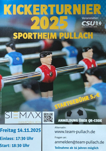 Hey, Kicker-Fans! Am Freitag, 14.11.2025, wird's im Sportheim Pullach richtig actionreich – unser Turnier startet mit Einlass um 17:30 und erstem Kick-off um 18:30. Die Startgebühr beträgt pro Person 5 Euro. Teams bestehen aus je 2 Personen. Mindestteilnahmealter: 16 Jahre. Holt eure Teams zusammen, zeigt Power am Tisch und lasst die Tore regnen!