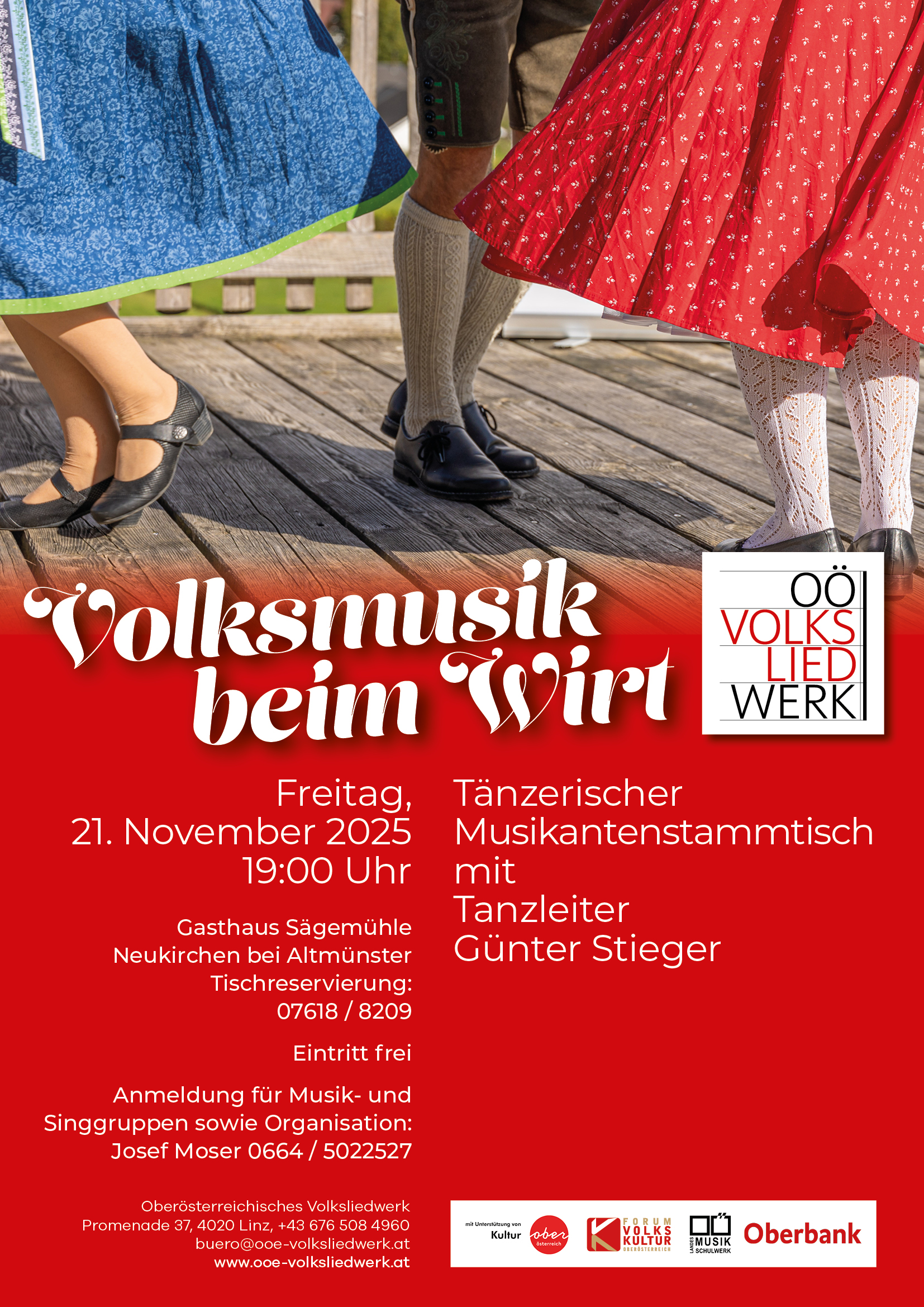 Herzliche Einladung zum Volksmusik beim Wirt - Tänzerischer Musikantenstammtisch zu Kathrein mit Tanzleiter Günter Stieger am Freitag, 21. November 2025 im Gasthaus Sägemühle in Neukirchen bei Altmünster