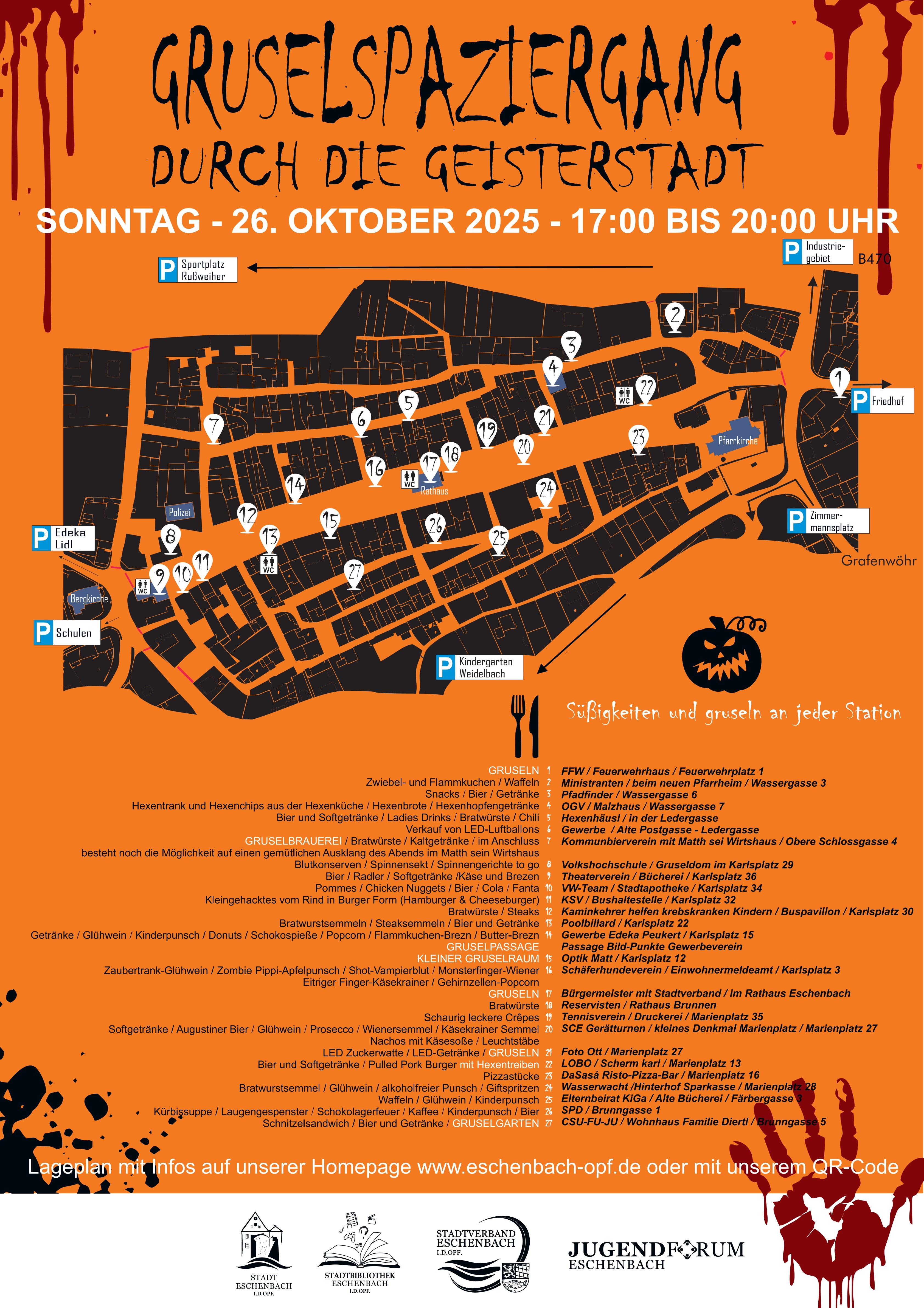 Ein Gruselspaziergang für die ganze Familie in der Altstadt von Eschenbach.Auf euch warten 27 Gruselstationen, bei denen sich Kinder Süßes holen können und/oder Essen und Getränke erhältlich sind. Im Vergleich zum letzten Jahr haben wir das Essensangebot erheblich aufgestockt. Es gibt Schnitzel-, Bratwurst-, Leberkäs-, Wiener- und Käsekrainersemmeln, Pizza, Pommes, Schwarze Würmer in Blutsoße (Spaghetti Sepia mit Tomatensoße), Hotdogs, Gemüseientopf, Hexenchips, Kürbissuppe, Pulled Pork Burger, Käse mit Breze, Popcorn, Zuckerwatte, Crepês, Waffeln, Muffins und weitere spannende Halloween-Specials.Alle Stationen liegen auf einem Rundweg, aber wo ihr beginnt und aufhört, spielt keine Rolle.Die Innenstadt wird für die Dauer der Veranstaltung für den Verkehr gesperrt.