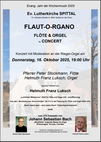 Unter dem Titel "FLAUT-O-RGANO" (Konzert für Flöte und Orgel) spielen Peter Stockmann, Pfr. (Spittal) Querflöte und Helmuth Franz Luksch (Pusarnitz) Orgel.