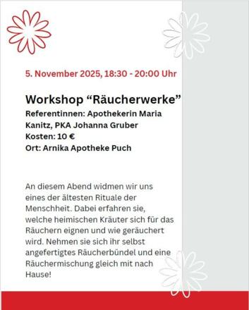 Die Arnika Apotheke in Puch lädt regelmäßig zu kostenlosen Veranstaltungen und Vorträgen ein. Dieses Mal dreht sich alles um das Thema "Räucherwerke".
