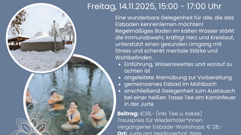 | Preisinformation | € 38,- (inkl. Tee u. Kekse), Treuepreis für Wiederholer*innen vergangener Eisbade-Workshops: € 28,- |