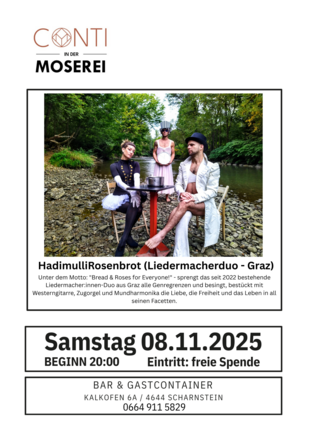 Unter dem Motto "Bread & Roses for Everyyone!" - sprengt das seit 2022 bestehende Liedermacher:innen-Duo aus Graz alle Genregrenzen und besingt, bestückt mit Westerngitarre, Zugorgel und Mundharmonika die Liebe, die freiheit und das Leben in all seinen Facetten.