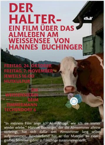Kino bei der Weissenseerin. „Der Halter – ein ein außergewöhnlicher Film über das Almleben hier am Weissensee“. Beginn 16.00 Uhr. Platzreservierung auf www.dieweissenseerin.at , Bezahlung direkt vor Ort von € 5,- bis € 7,-.