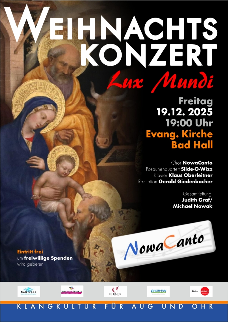 der Chor NowaCanto mit seinem Chorleiter Michael Nowak freut sich sehr, dass wir zum ersten Mal ein Weihnachtskonzert in Bad Hall veranstalten und wir dazu herzlich alle Bad Hallerinnen und Bad Haller einladen dürfen.