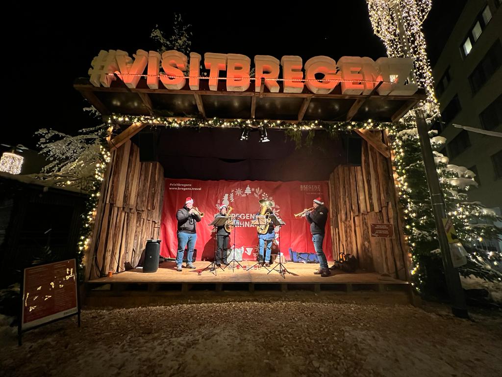 Das Zimtsternquartett - ein Ensemble aus Musikern mit Leidenschaft - sorgt mit festlicher Blasmusik für weihnachtliche Stimmung auf dem Bregenzer Weihnachtsmarkt.