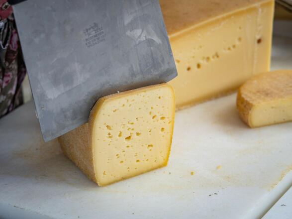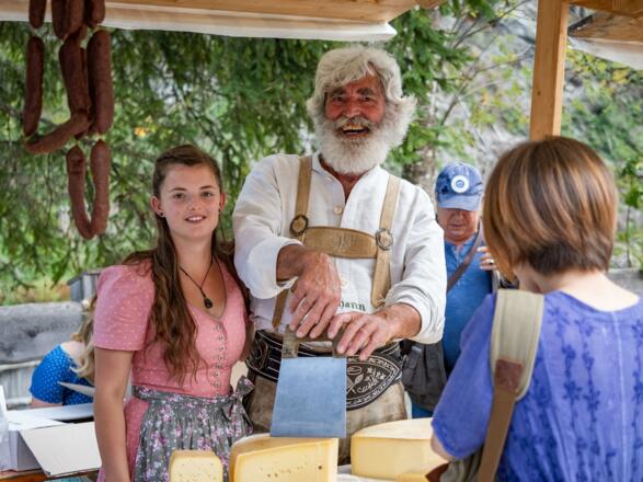 • Die örtlichen Bäuerinnen und Produzenten bieten ihre vielfältigen Produkte an. Das Angebot reicht von schmackhaften Käse bis zu Schnapsspeziaitäten.