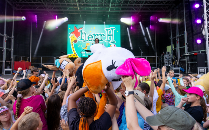Auf der großen Festivalbühne findet täglich das Tagesfinale mit den beiden Konzerten statt – teilweise sogar unter Mitwirkung der Workshop-Kids.