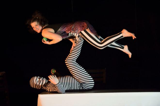Das nonverbale Stück vereint auf humorvolle Art Körpertheater, Akrobatik, Tanz, (Fuß-)Jonglage, Objektmanipulation und Live-Musik. Drei Artist_innen und eine Musikerin erzählen eine surrealistische Geschichte über Einsamkeit, Sehnsüchte und Identität.