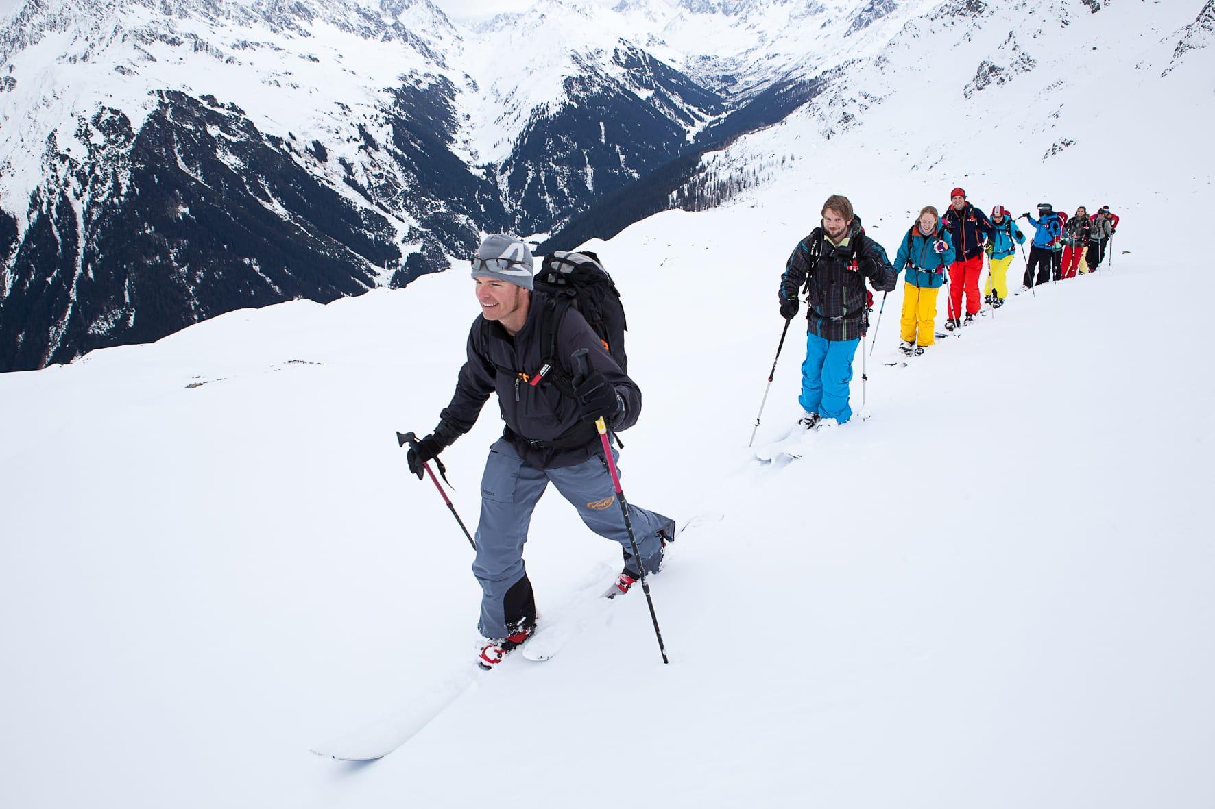 - Sonntag: Schulung des Verständnisses für Alpine Gefahren, Aufstiegstechnik im Gelände / Spurlage in Theorie und Praxis.