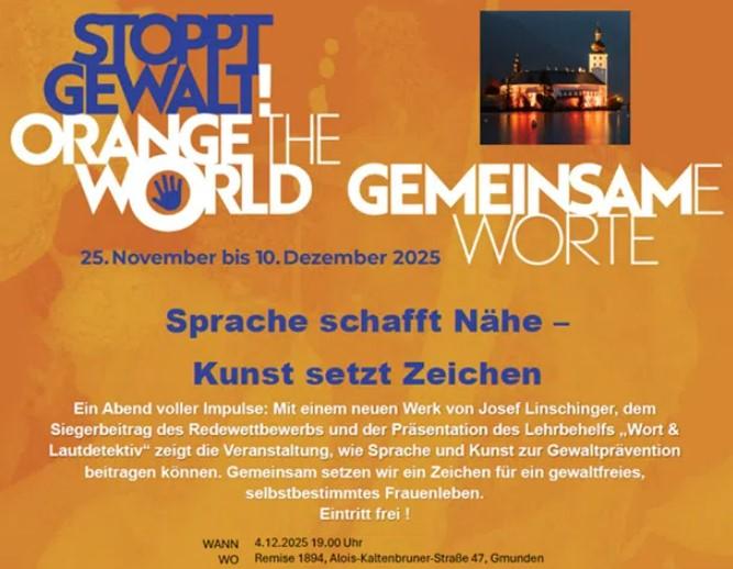 Der Soroptimist Club Traunsee lädt in Kooperation mit dem Rotary Club Gmunden unter dem Motto „Gemeinsame Worte“ zu einem besonderen Event ein: Unter anderem mit dem neuen Werk von Josef Linschinger, dem Siegerbeitrag des Redewettbewerbs und der Vorstellung des Lehrbehelfs „Wort & Lautdetektiv“ – alles Beispiele dafür, wie Worte verbinden und Bewusstsein stärken. Ein inspirierender Abend im Zeichen von Kunst, Kommunikation und Gewaltprävention.