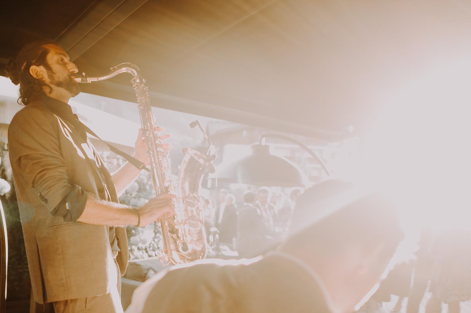 Live Saxophon & DJ Sound auf der Sonnenterrasse. Cocktails, Sonne & Sound mit Bergblick.