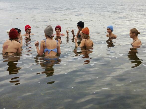 - 20 min Eisbaden (umziehen, zum Wasser gehen, eintauchen und mit der Natur verbinden)