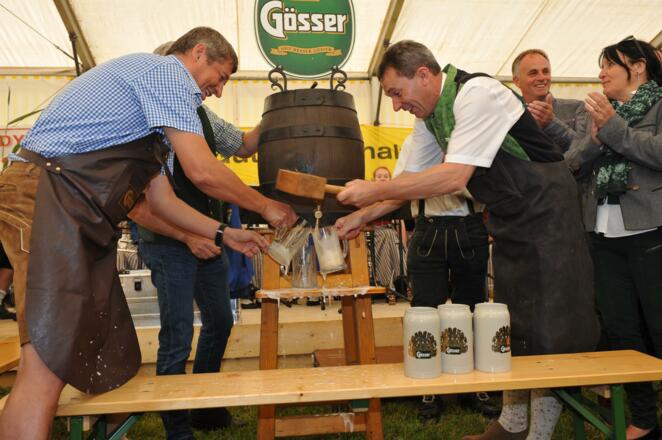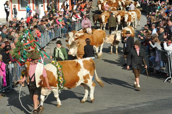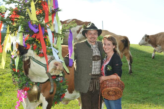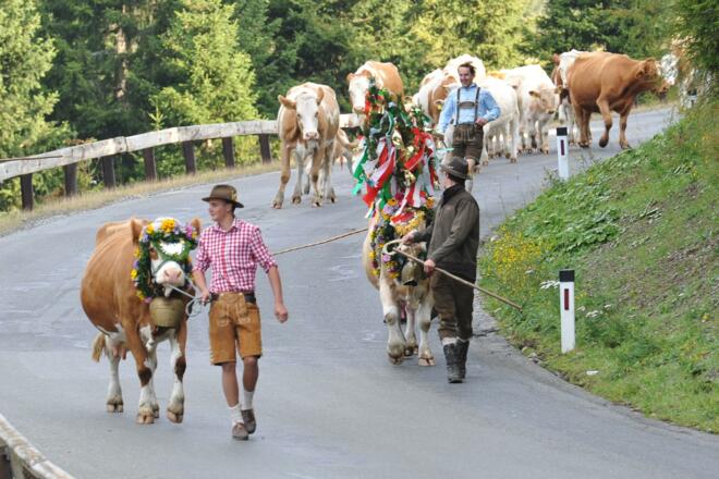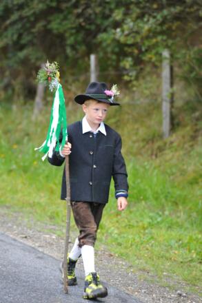 09:30 Uhr: Ankunft der geschmückten Almtiere am Hochegg. Die Almbauern mit ihren Tieren werden vom Musikverein Schönberg-Lachtal empfangen.