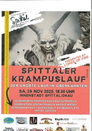 Am Samstag, den 29.11. um 18.30 Uhr ziehen rund 1.000 Perchten und Krampusse durch unsere schöne Lieserstadt, um ihr Publikum das Fürchten zu lehren. Die finsteren Gesellen folgen der Einladung zum Spittaler Krampuslauf – dem größten Lauf in Oberkärnten. Freuen Sie sich auf schaurige Shows und urige Gruppen mit Liebe zum Brauchtum, moderiert von Joschi Peharz und Harald Wieser. Ausklingen lassen kann man den fulminanten Abend am Weihnachtsdorf oder am Discozelt der heimischen Perchtengruppe „Lords of Fire“, welche auch Mitveranstalter dieses Events sind.