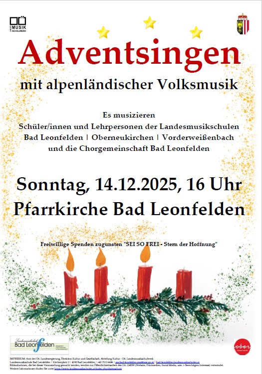 Adventliche Weisen und Lieder alpenländischer Volksmusik gibt es am Sonntag, 14. Dezember 2025 beim traditionellen ADVENTSINGEN der Landesmusikschule und der Chorgemeinschaft Bad Leonfelden in der Pfarrkirche Bad Leonfelden zu hören. Neben verschiedenen Instrumentalensembles ist auch wiederum die Singschule der Landesmusikschulen Bad Leonfelden | Oberneukirchen | Vorderweißenbach dabei.