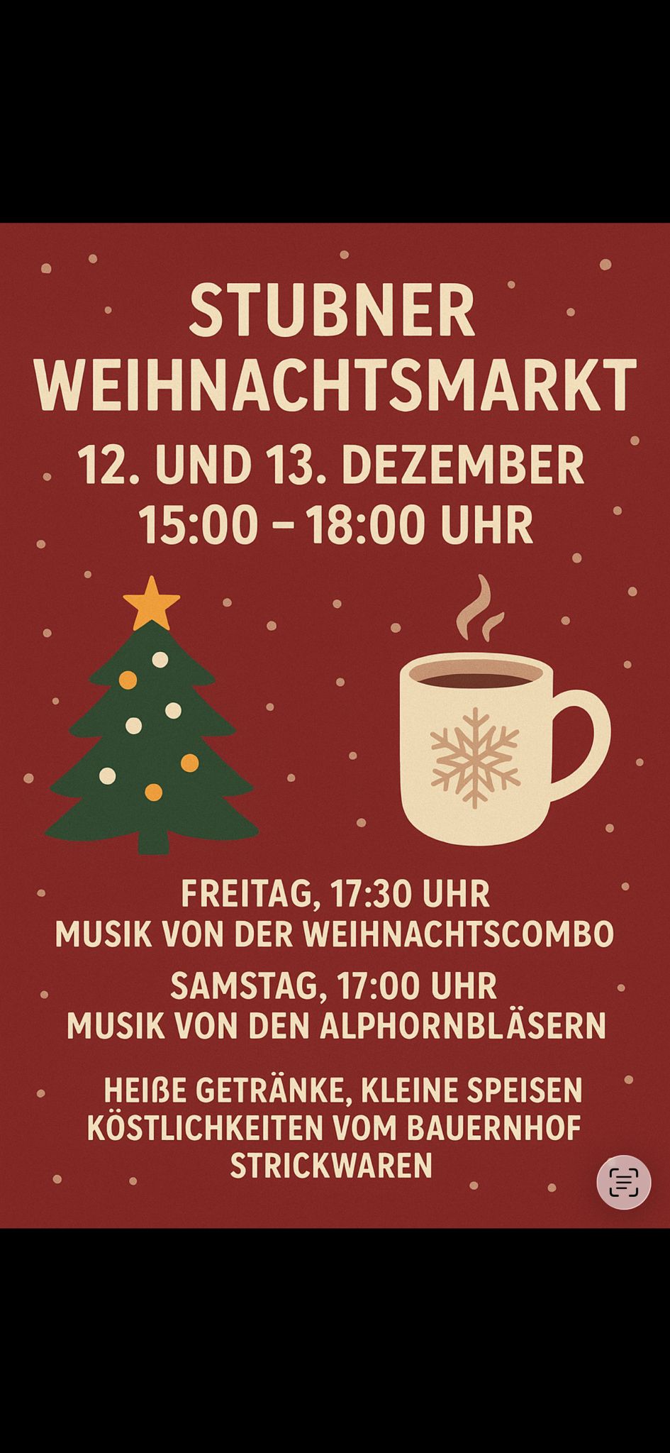 Glühwein, Glühmost, Raclettebrot und vieles Mehr - beim Weihnachtsmarkt in Stuben am Arlberg. Am 12.12. und 13.12.2025 jeweils von 15.00 - 18.00 Uhr.