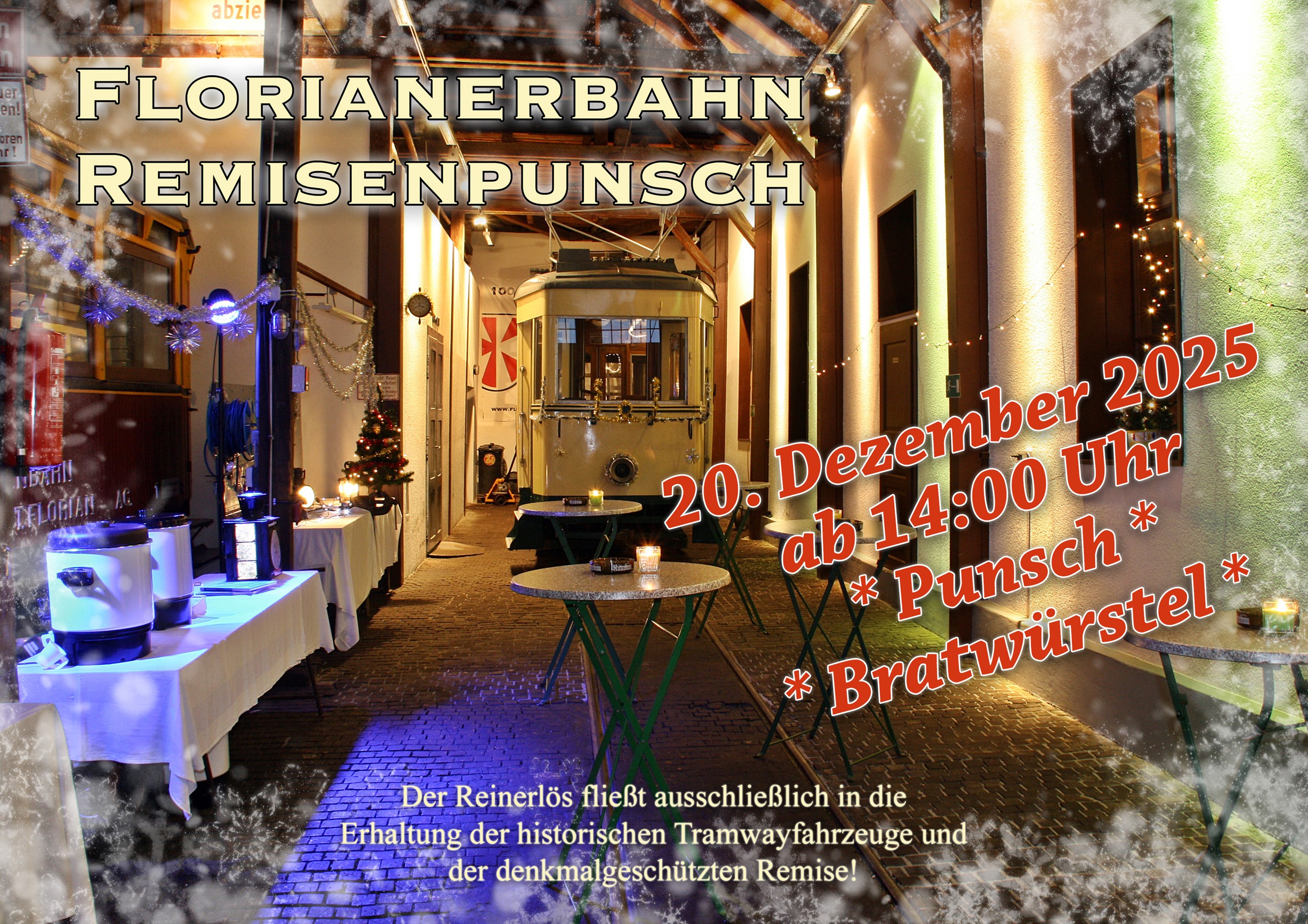 Im stimmungsvollem Ambiente zwischen den historischen Tramway-Wagen erwartet Euch Punsch, Kinderpunsch, Glühmost, Bier, Alkoholfreies und Kaffee.