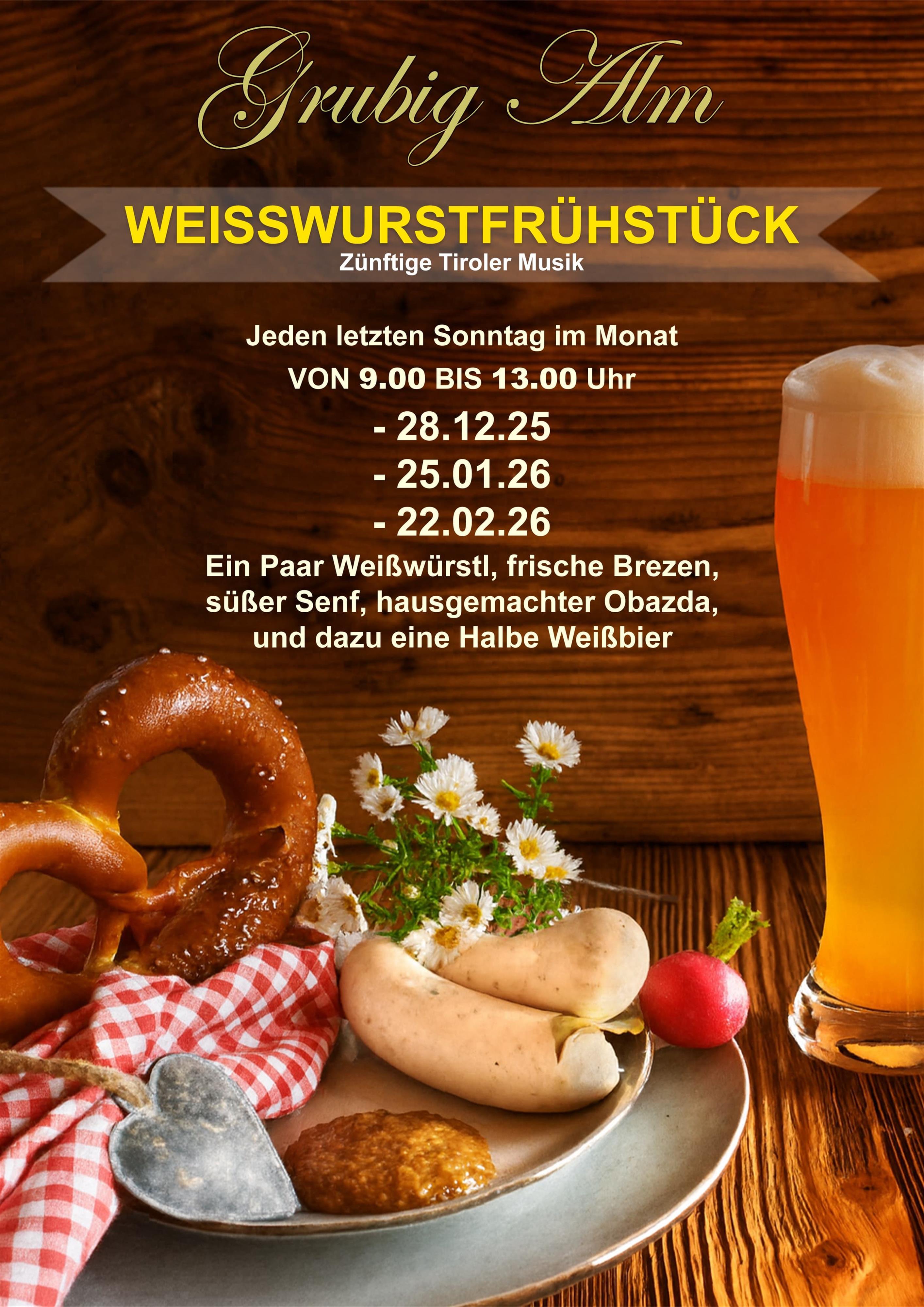 Ein Paar Weißwürstl, frische Brezen, süßer Senf, hausgemachter Obazda und dazu eine Halbe Weißbier