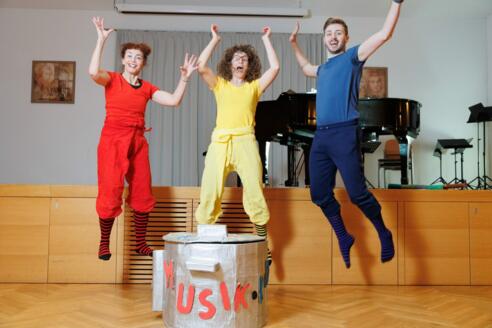 Neugierig und verspielt gehen sie der Musik und der Bewegung auf den Grund. Mit Tanz, Stimme und Clownerie kochen sie gemeinsam mit dem Publikum einen lebendigen Musik.Koch.Topf voller Fantasie, Klang und Begegnung.