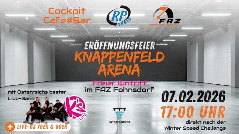 Das FAZ Fohnsdorf feiert die Eröffnung der Knappenfeld Arena, einem Eventareal für Konzerte, Feste und mehr. Es unterhalten euch K´s und mit einem Live-DJ wird mit HIts der 70er und 80er Hits Gas gegeben. Eintritt frei!