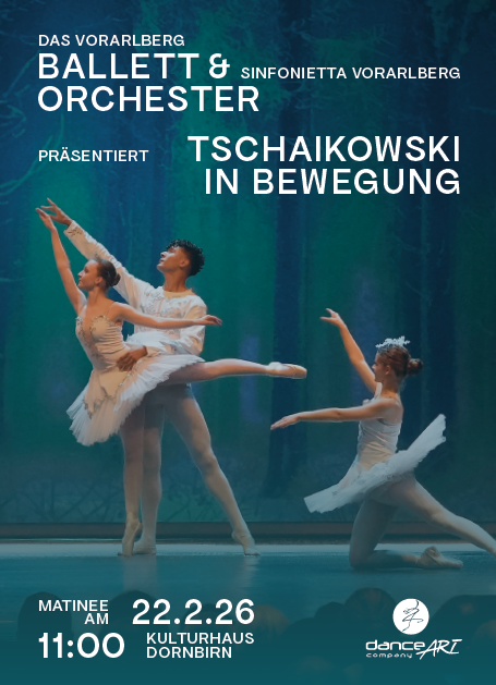 Am Sonntag, den 22. Februar 2026, lädt das Vorarlberg Ballett gemeinsam mit der Sinfonietta Vorarlberg zur neuen Matinee-Reihe für Familien ins Kulturhaus Dornbirn ein. Ein Vormittag ganz im Zeichen des klassischen Tanzes und der unvergleichlichen Musik von Pjotr Iljitsch Tschaikowski: Die Tänzer:innen des Vorarlberg Balletts bringen Highlights aus »Schwanensee«, »Dornröschen« und »Der Nussknacker« auf die Bühne – begleitet vom Orchester in voller Klangpracht. Von funkeln- den Pas de Deux über den berühmten Tanz der kleinen Schwäne bis hin zu Märchenwalzern und feierlichen Märschen erwartet das Publikum ein mitreißendes Erlebnis für große und kleine Besucher:innen. Eine neue Veranstaltungsreihe, die Klassik erlebbar macht – poetisch, virtuos und zauberhaft. Tickets | VVK Dornbirn Tourismus: Erwachsene 35,– | Kinder (bis 12 Jahre) 14,– Jugend (bis 18 Jahre) 25,– TSCHAIKOWSKI IN BEWEGUNG danceart-