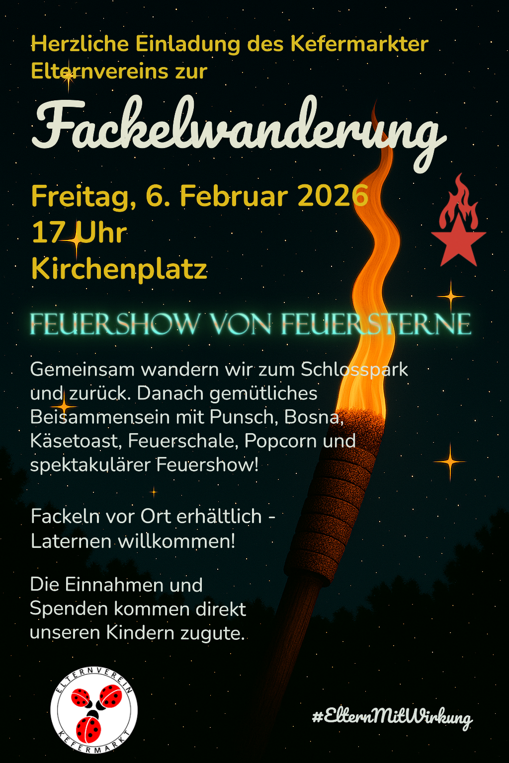 Gemeinsame Wanderung zum Schlosspark. Danach gibt es am Kirchenplatz Punsch, Bosna, Käsetoast, Feuerschale, Popcorn und eine spektakuläre Feuerschow!