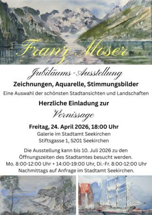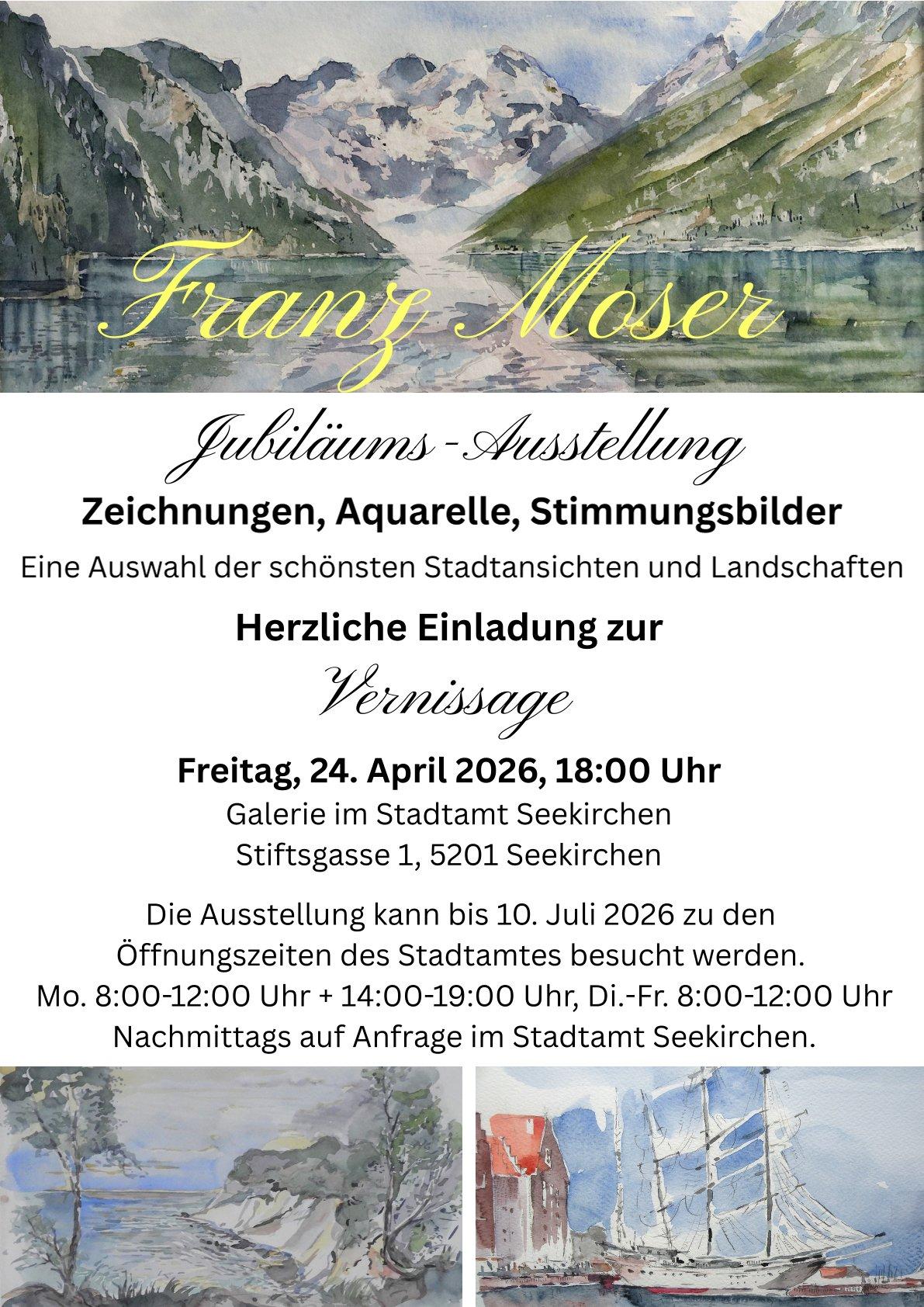 Herzliche Einladung zur Vernissage am Freitag, 24. April 2026, um 18:00 Uhr in der Galerie im Stadtamt Seekirchen, Stiftsgasse 1, 5201 Seekirchen.