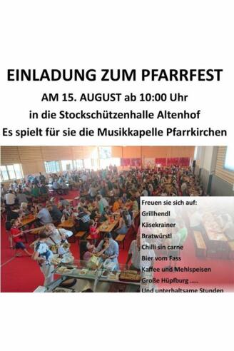 Die Pfarre Pfarrkirchen lädt wieder zum Pfarrfest sehr herzlich ein. Es findet in der Stockschützenhalle Altenhof statt.
