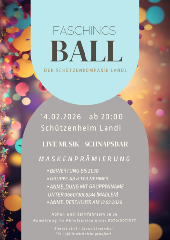 Die Schützenkompanie Landl veranstaltet wieder den alljährlichen Faschingsball mit Maskenprämierung. Der Ball findet wieder im Schützenheim Landl (Landl 74) statt.